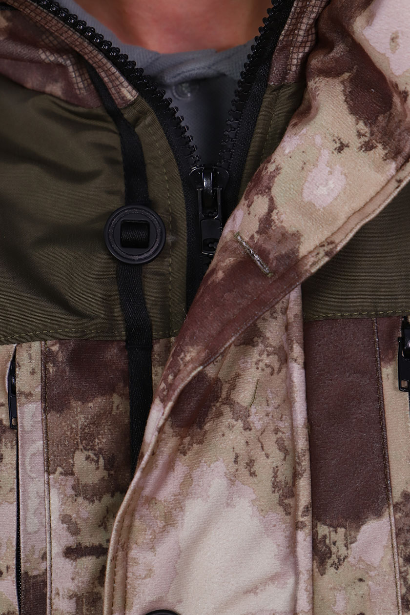 По линии талии находится кулиса. Капюшон регулируется кулисами и фиксатором. Рукава с фигурными налокотниками и трикотажными манжетами, по линии локтя кулиса,выше расположены накладные карманы с фигурными клапанами. По низу куртки, для регулировки объема, предусмотрена кулиса.