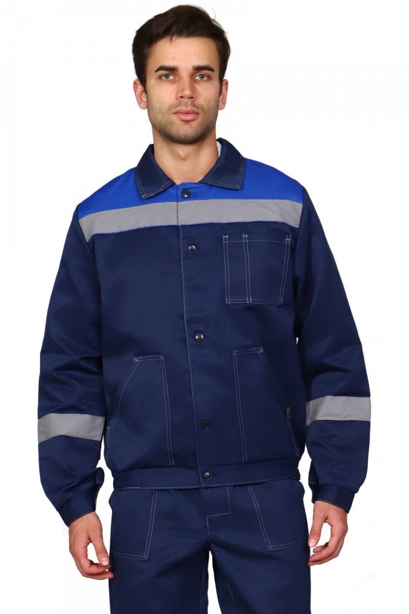 ➠ Куртка укороченная, с притачным поясом. Центральная бортовая застежка на петли и пуговицы. Воротник отложной. Один нагрудный накладной карман с отделением для ручки. Два нижних накладных кармана с наклонным входом. Рукава с манжетами, застегивающимися на пуговицу, с налокотниками. Притачной пояс с участками эластичной тесьмы по бокам. По шву притачивания кокетки и по рукавам СОП 50 мм.