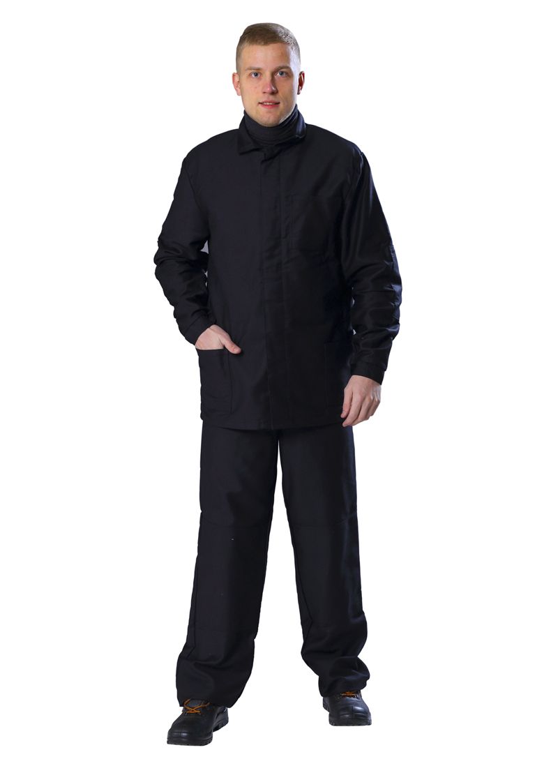 Продажа и поставка оптом черного жаростойкого молескинового костюма для сварщика от повышенных температур.